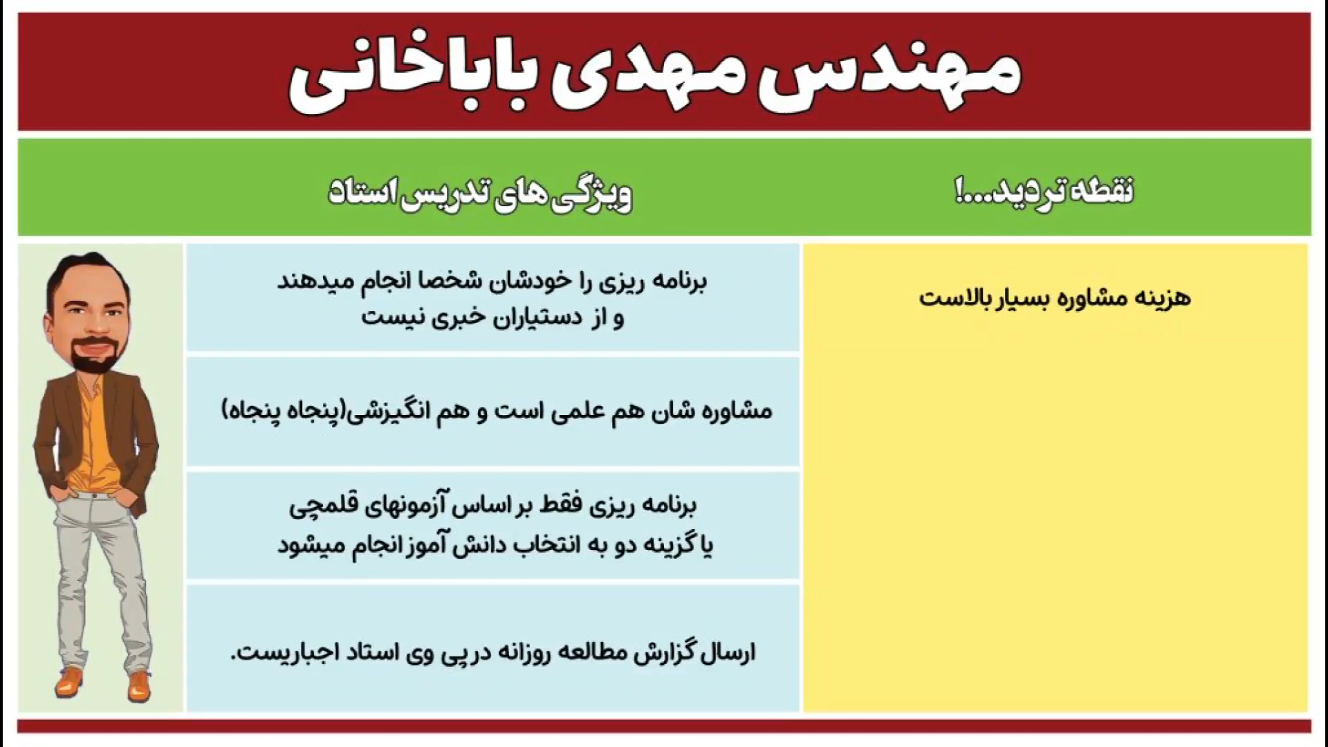 Мехоҳед дар интихоби риштаи худ дар имтиҳони дохилшавӣ ба донишгоҳ беҳтарин қарорҳоро қабул кунед? Мо ба шумо 6 нафар аз беҳтарин мушовирони соҳаеро муаррифӣ мекунем, ки бо таҷриба ва донишашон шуморо роҳнамоӣ мекунанд. Ин имконияти беҳтарин барои шумо аст, ки роҳи дурустеро интихоб кунед ва ба орзуҳои худ наздик шавед!