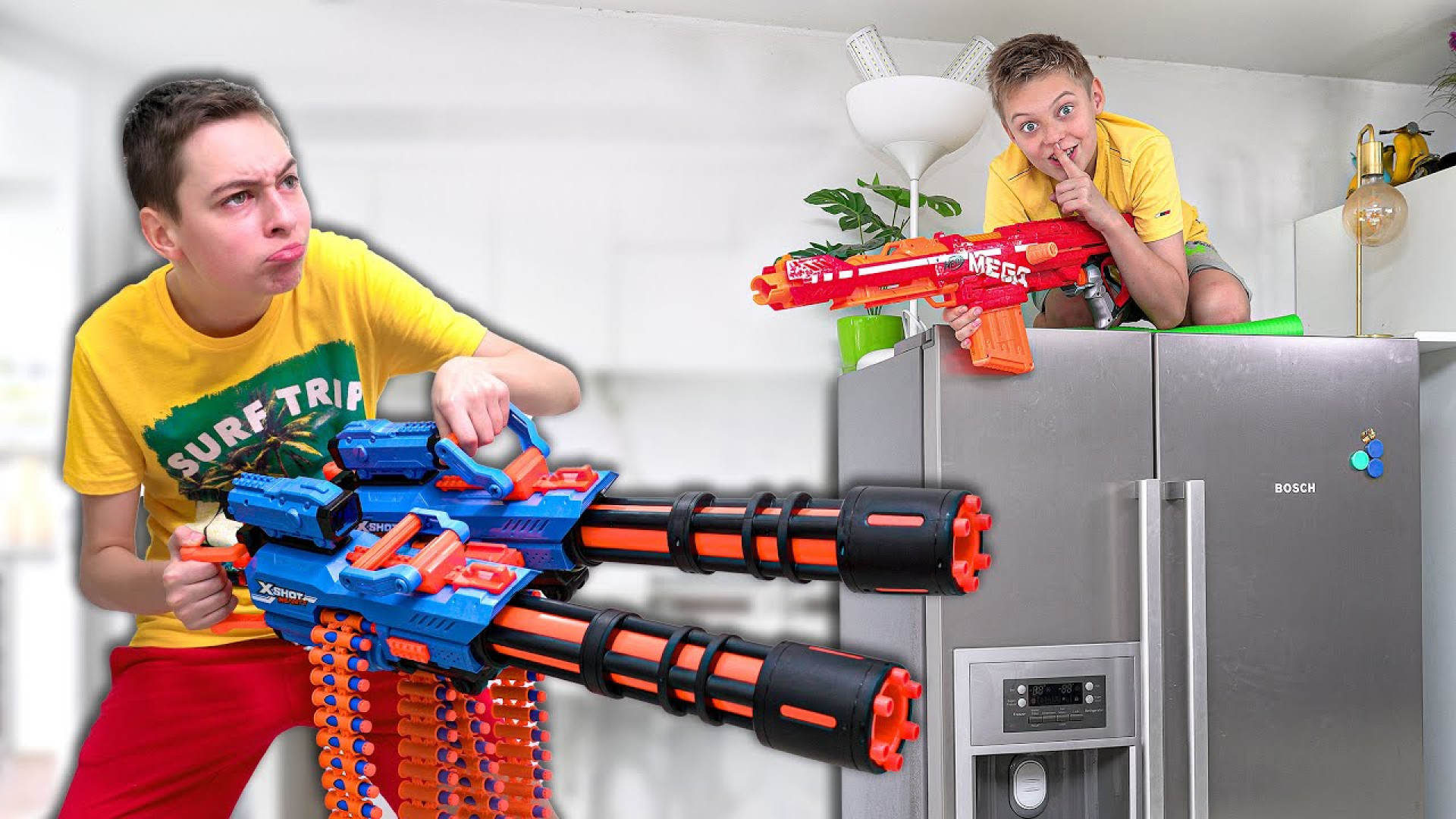 Ҳаргиз чунин тирпаронии ҳаяҷоноварро надидаед! Ду бародар бо туфангҳои бозича Нерф ба майдон мебароянд ва як ҷанги нобаробарро оғоз мекунанд! Ин барномаи кӯдаконаи писарона пур аз ҳаяҷон ва ханда аст. Агар шумо ҳам мехоҳед, ки дар ин ҳаяҷон иштирок кунед, пас видеоро то охир тамошо кунед!