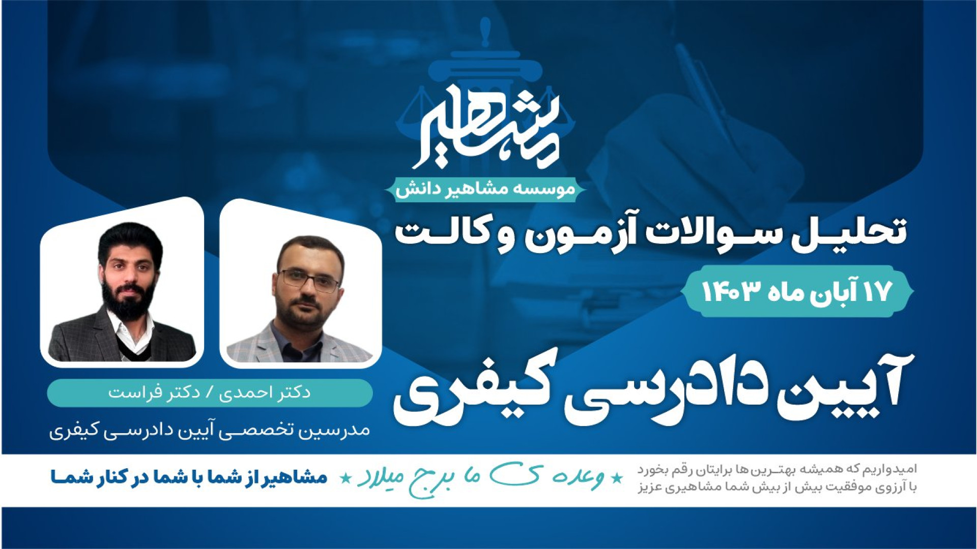 Дар ин видео, мо ба таҳлили саволҳои ойини додраси ҷиноятӣ аз озмуни вакаолат 403 бо ҳамроҳии Доктор Фарост ва Доктор Аҳмадӣ мепардозем. Мақсади мо ин аст, ки ба шумо дар фаҳмиши беҳтари ин мавзӯъ кӯмак кунем ва худатонро барои озмуни оянда омода созед. Агар ба шумо мавзӯъҳои ҳуқуқӣ ва омодагӣ ба имтиҳонҳо писанд аст, ин видеоро тамошо кунед!