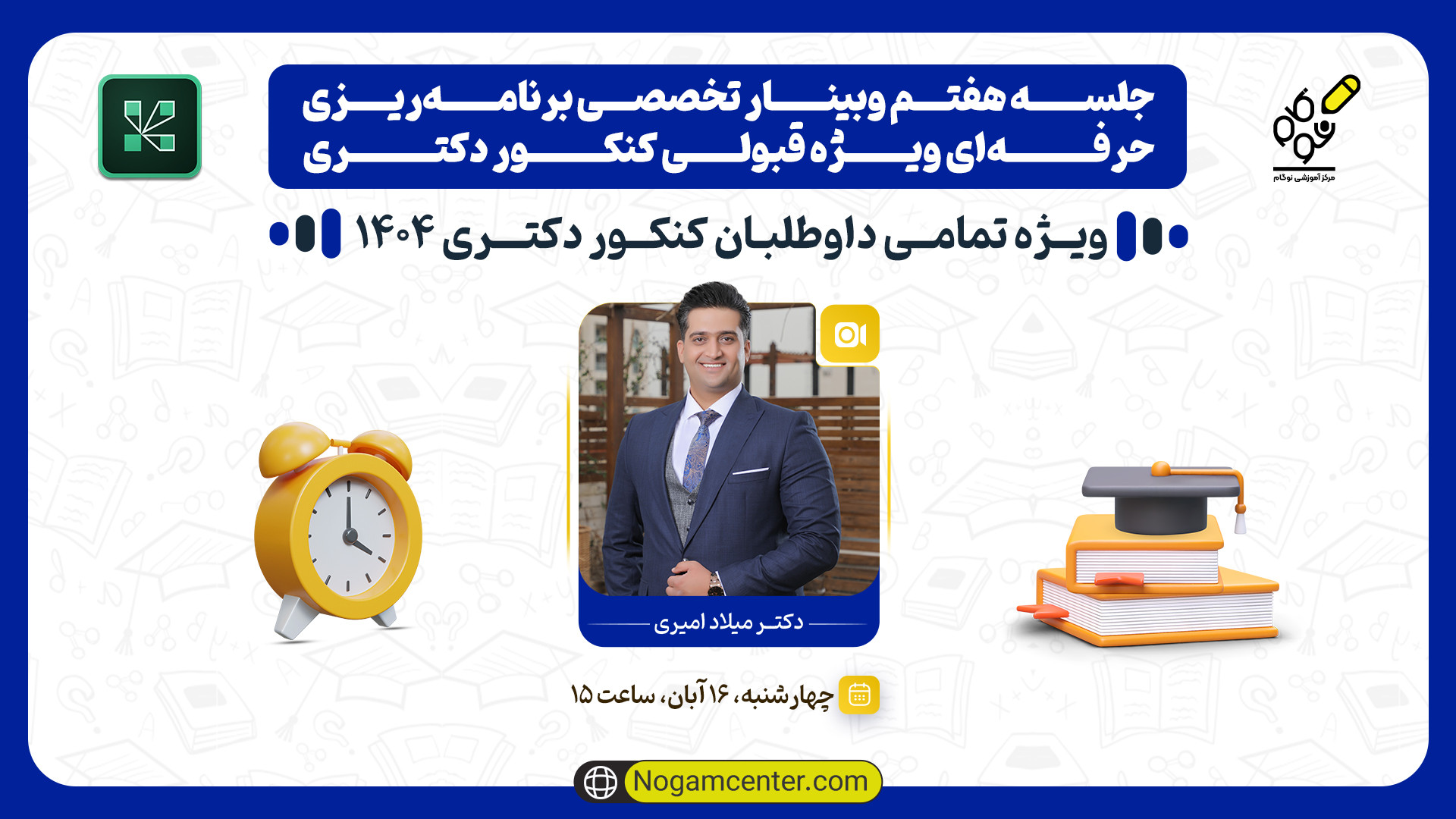 Дар ин вебинари ҳафтуми мо, доктор Милод Амирӣ ба шумо усулҳои навини нақшакашии касбиро барои омодагӣ ба имтиҳони дохилшавии докторӣ меомӯзонад. Агар мехоҳед, ки дар имтиҳон муваффақ шавед ва ба дараҷаи докторӣ даст ёбед, ин вебинарро аз даст надиҳед! Ба мо ҳамроҳ шавед, то роҳҳои беҳтарини омодагиро дарёфт кунед.