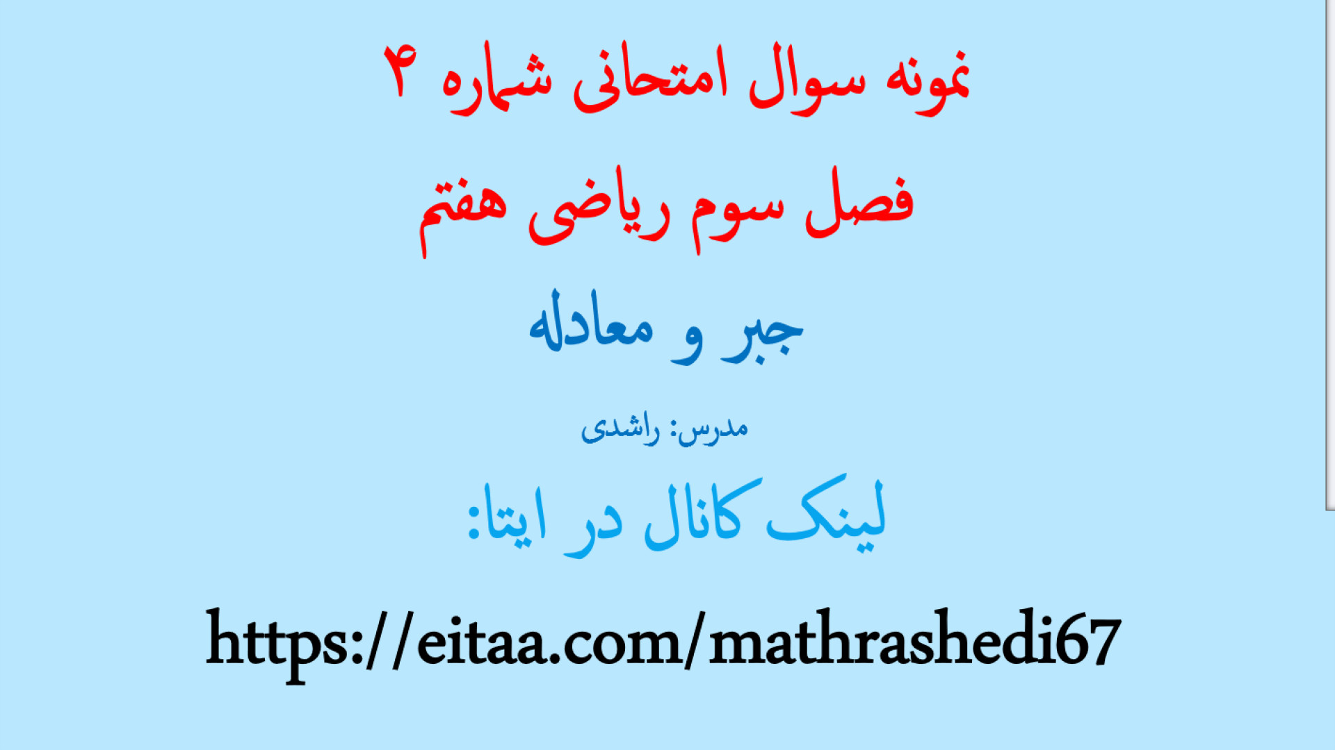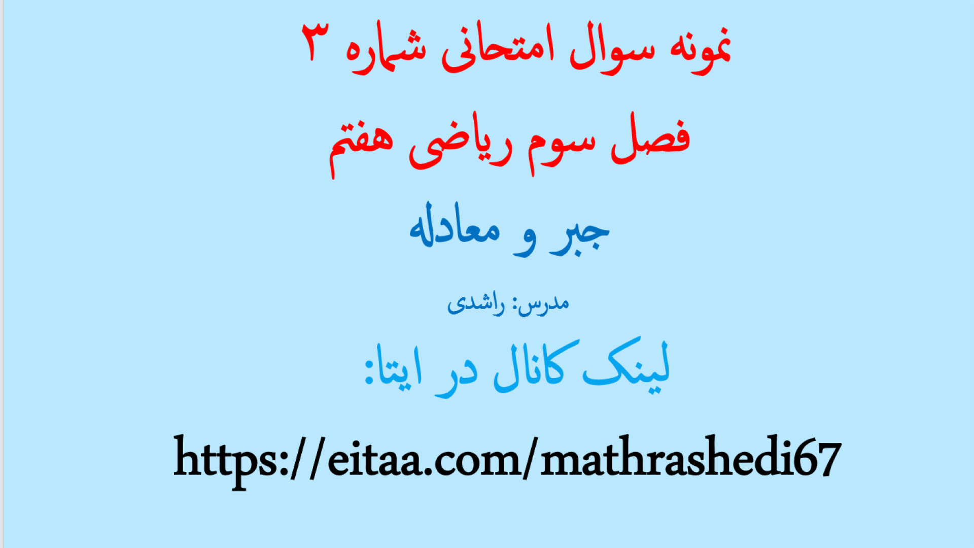 Дӯстони азиз! Дар ин видео саволҳои имтиҳонии риёзи синфи ҳафтумро дар фасли сеюм, ки дар бораи ҷабр ва муодила аст, баррасӣ мекунем. Агар мехоҳед дар имтиҳонҳо бомуваффақият шавед ва ба саволҳои сахт омодагӣ гиред, ин видео барои шумо аст! Тамошо кунед ва бо мо ҳамроҳ шавед то ҳамаи саволҳоро ҳал кунем.