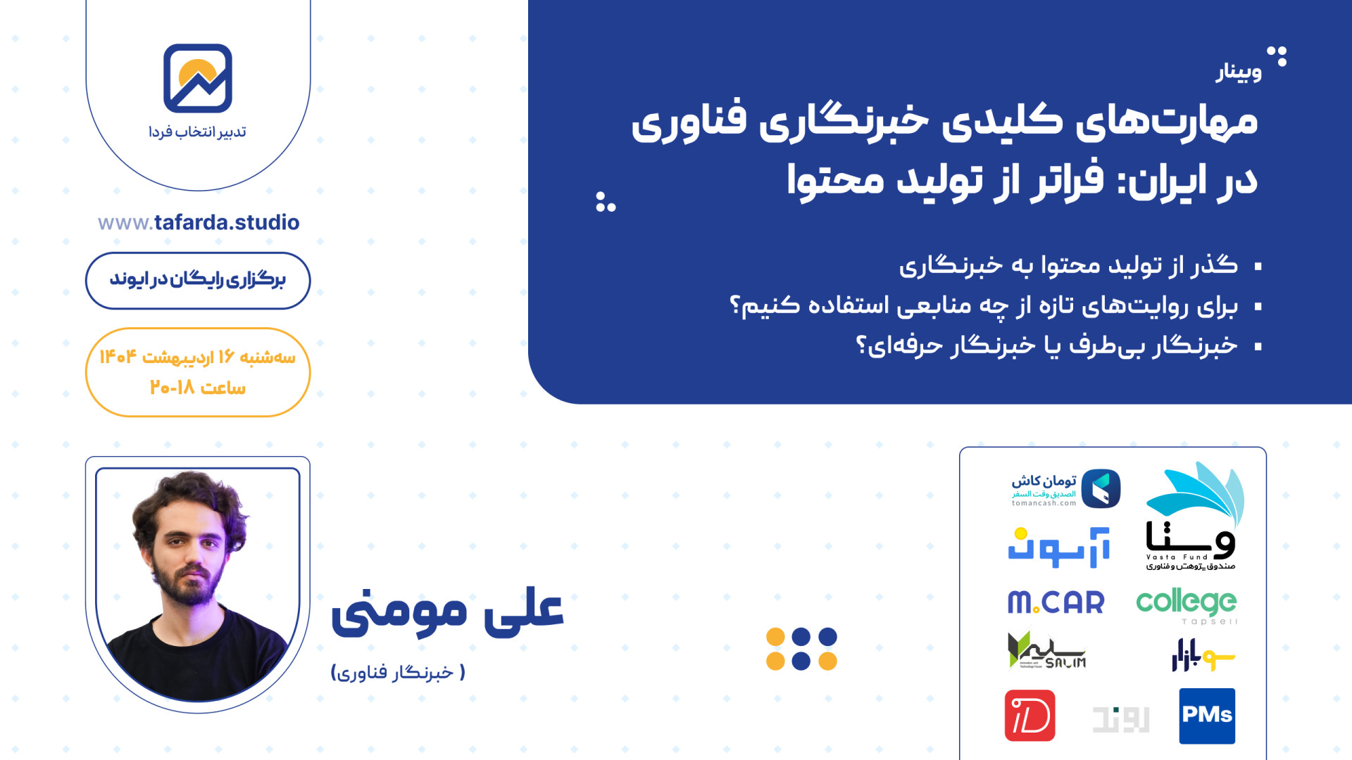 Оё мехоҳед дар соҳаи хабарнигории технологияҳо дар Эрон пешсаф бошед? Пас ин видео барои шумост! Али Муминӣ, коршиноси соҳаи технология, дар қисми дуюми силсилааҳбори худ, маҳорати калидиро, ки барои хабарнигорони технология дар Эрон муҳим аст, нақл мекунад. Бо мо бимонед, то аз таҷрибаҳои беҳтарин ва маслиҳатҳои амалӣ баҳраманд шавед.