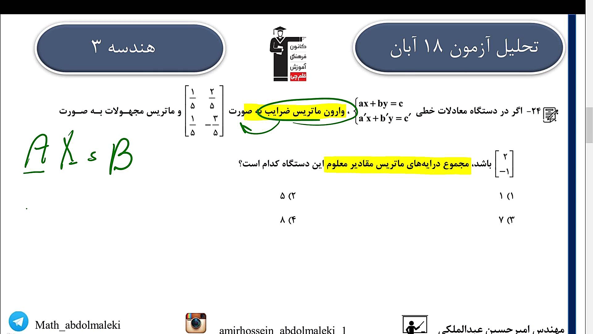 Дар ин видео мо ҷавобҳои имтиҳони математикаи синфи 9 Қаламчиро, ки дар санаи 18 Обон 403 баргузор шуд, ба таври муфассал шарҳ медиҳем. Қисми якуми ин шарҳҳо ба шумо кӯмак мекунад, ки фаҳмиши беҳтар аз масъалаҳои пешниҳодшударо пайдо кунед. Агар шумо мехоҳед истеъдоди худро дар математика беҳтар кунед ва ба натиҷаҳои беҳтарин бирасед, ин видео барои шумост!