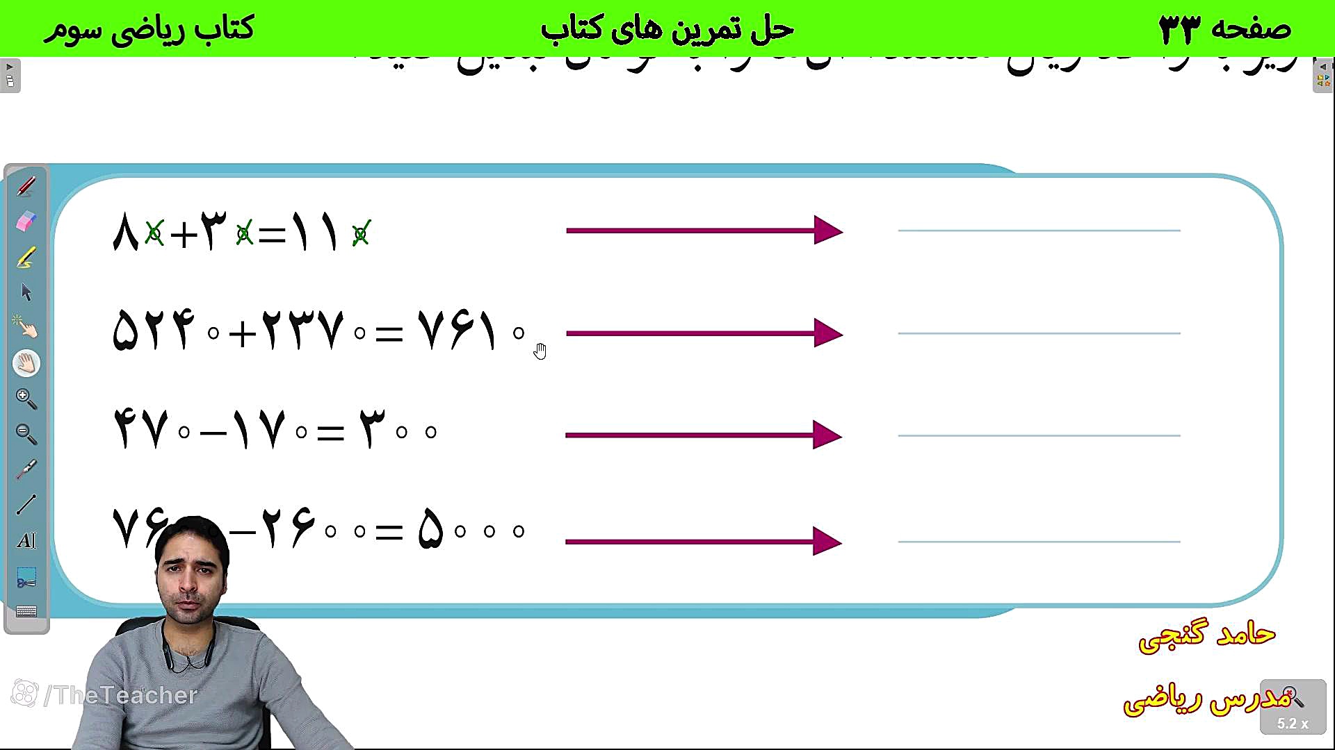 Дар ин видео, мо саҳифаи 33 аз китоби риёзии синфи сеюмро баррасӣ мекунем. Ҳомид Ганҷи бо усули осон ва фаҳмо машқҳои ин саҳифаро ҳал мекунад. Ҳар касе, ки мехоҳад дар фаҳмидани риёзӣ пешравӣ кунад, ин видеоро тамошо кунад!