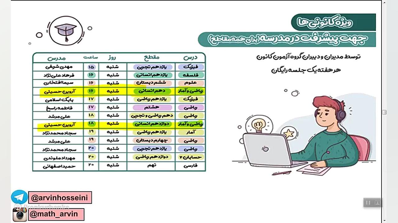Таҳлил ва шарҳи пурра ба имтиҳони Қаламчӣ барои риёзии синфи ёздаҳум инсонӣ. Бо устод Аруин Ҳусейнӣ, беҳтарин фанҳои имтиҳониро ёд гиред ва ба худ боварӣ кунед. Аз ин фурсат истифода баред, то ба имтиҳонҳоятон омодагии хуб дошта бошед!